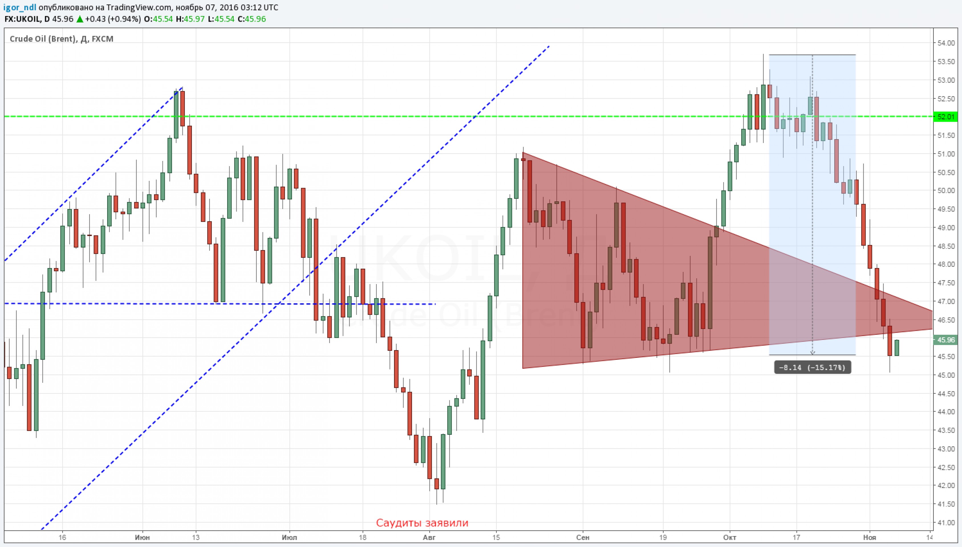 Тем временем страны ОПЕК пока никак не могут договориться между собой. Обещанная еще в конце сентября сделка по сокращению или ограничению добычи висит буквально на волоске, конечно, если верить поступающей информации. В пятницу вообще дошло до того, что Саудовская Аравия пригрозила нарастить добычу, если соглашение не будет достигнуто. Но сейчас все эти сообщения носят скорее локальный характер. Мы видим, что рынок живет своей жизнью и все движения связаны исключительно с выборами в США, причем рынок, кажется, сам не понимает, чего ждать от результатов.