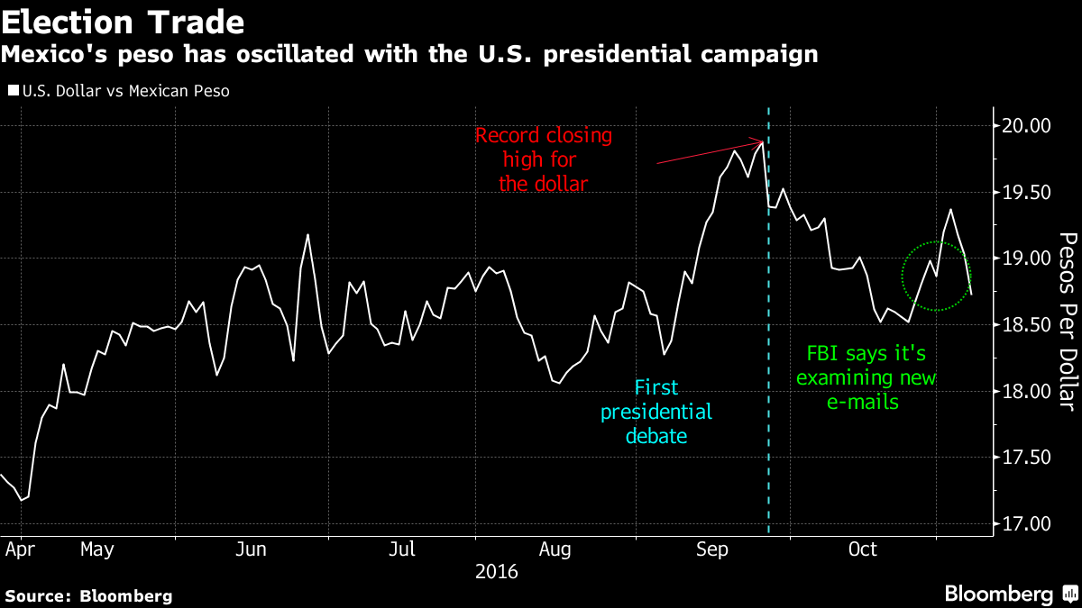 В ФБР заявили, что не считают ситуацию с перепиской Клинтон преступлением. Возобновление расследования всего за неделю до выборов вызвало распродажу рисковых активов. Песо вырос на 2.1% против доллара по состоянию на 7:05 в Лондоне. Валюта снижалась каждый раз, когда лидерство Клинтон ослаблялось. Фьючерсы на индекс S&P 500 выросли на 1.3% следом за снижением в течение девяти дней. Индекс волатильности CBOE S&P 500, оценивающий колебания американских акций, вырос на 39% на прошлой неделе вокруг событий с Клинтон. Хотя президентская гонка ужесточилась, кандидат от демократов по-прежнему лидирует на 2.2% по результатам опросов RealClearPolitics.
