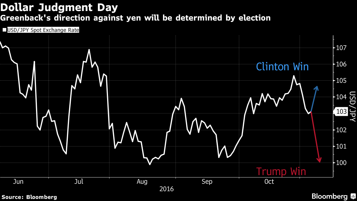 Реакция в понедельник аналогична той, которая разворачивалась в преддверии голосования Brexit, когда волатильность глобальной валюты взлетела в сторону максимума за четыре года. Лидерство Клинтон сокращалось до заявления ФБР, показывают опросы, что повысило градус опасений глобальных рынков из-за обещаний Трампа пересмотреть торговые соглашения США, тогда как в целом он кажется инвесторам менее предсказуемым. Доллар вырос на 1.4% до 104.58 иен по состоянию на 10:37 в Нью-Йорке после касания 104.63. Валюта выросла на 1% до $1.1034 за евро. Мексиканский песо, который был склонен к росту, когда Трамп сдавал позиции, вырос на 2.2%, что стало крупнейшим ростом среди основных валют. Индекс доллара Bloomberg, отслеживающий позиции валюты против 10 основных, вырос на 0.5% после снижение на 1.4%. Bloomberg опросил 10 наиболее точных аналитиков, чтобы спрогнозировать, в каком направлении доллар может торговаться против иены и евро в течение 24 часов и семи дней после выборов.