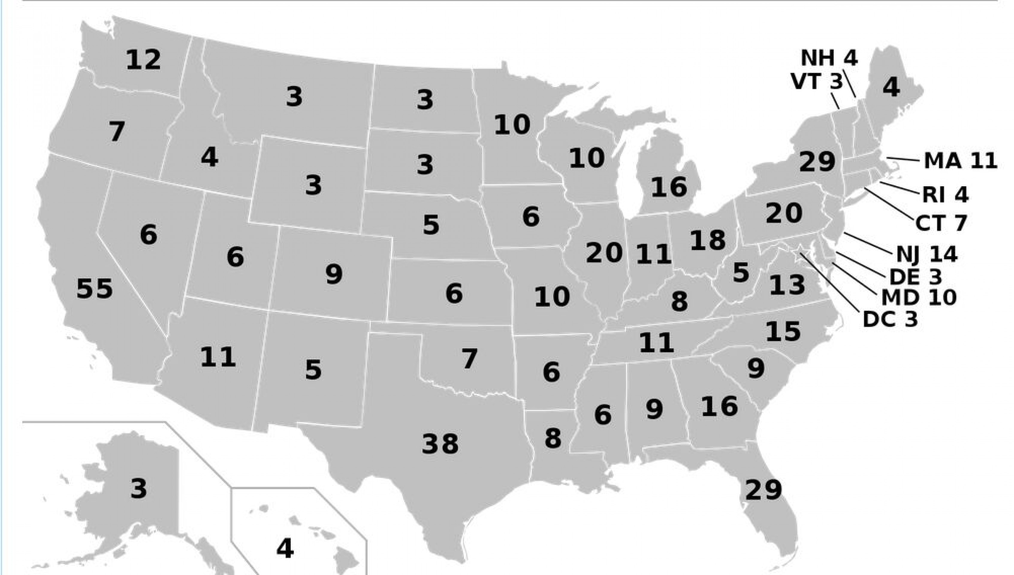 Коллегия выборщиков состоит из 538 человек. Для того чтобы стать президентом, одному из кандидатов нужно набрать 270 голосов выборщиков. Каждый из 50 штатов, в зависимости от численности проживающего в нем населения, посылает в коллегию от 3 до 55 выборщиков. Помимо этого, столица страны - город Вашингтон - представлен еще тремя выборщиками.