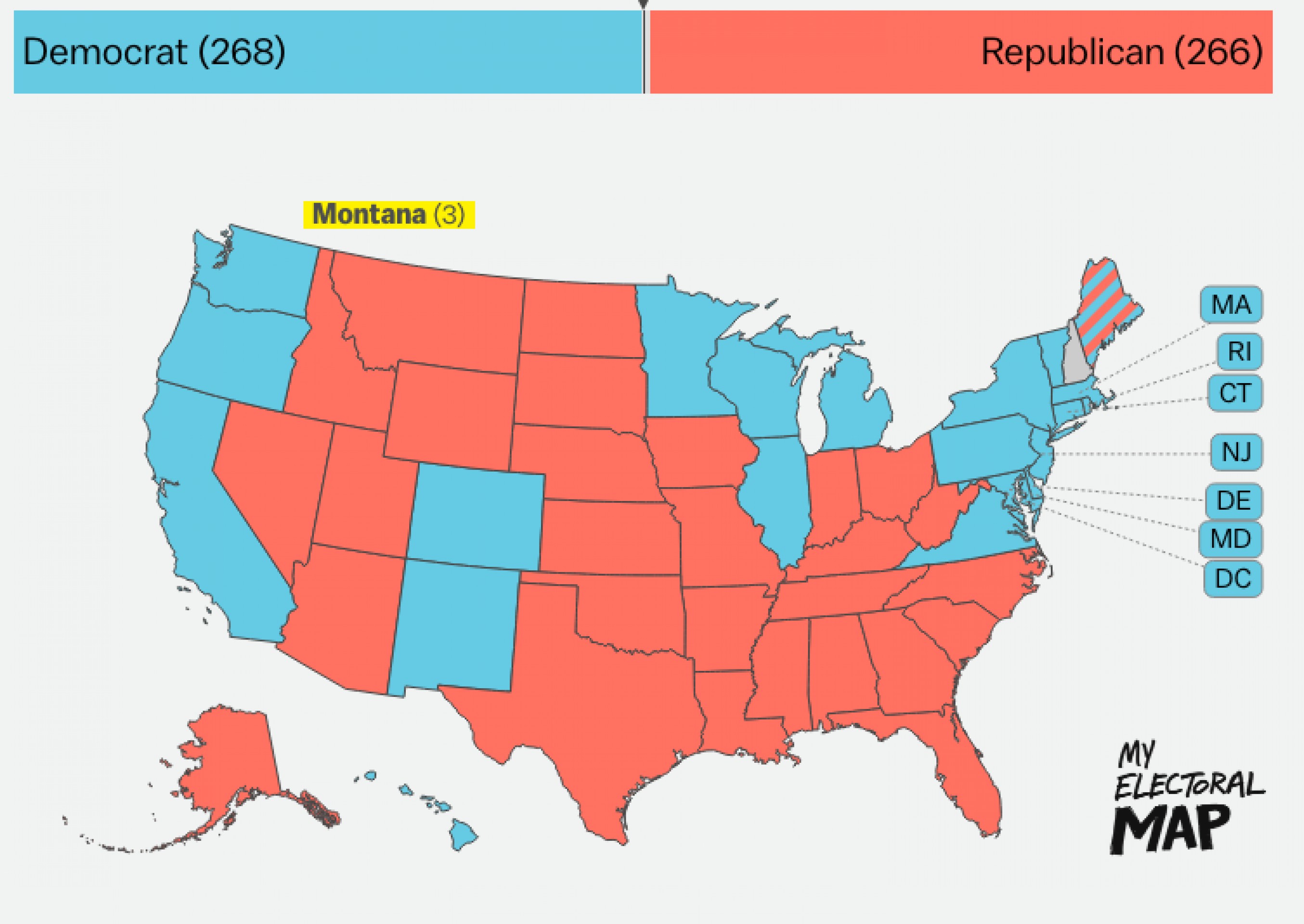 Не исключен сценарий, когда судьба выборов решится именно в штате Нью-Гэмпшир. Однако можно предположить, что голоса людей в этом штате распределяться поровну – допустим, 360212 за Клинтон и 360212 за Трампа.