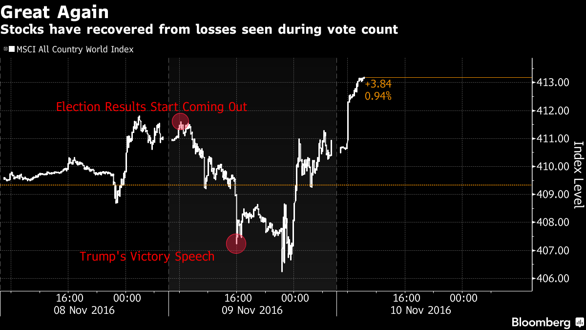 Произошел разворот инвесторских настроений после неожиданной победы Трампа, спровоцировавшей распродажу акций и стремление в сторону безопасных активов. Хотя волатильность всегда растет после выборов в США, первая реакция обычно не длится долго; также было и после Brexit в июне. Трамп сигнализировал о расходах более чем на $500 млрд. на восстановление американской инфраструктуры, а также пообещал снижение налогов.
