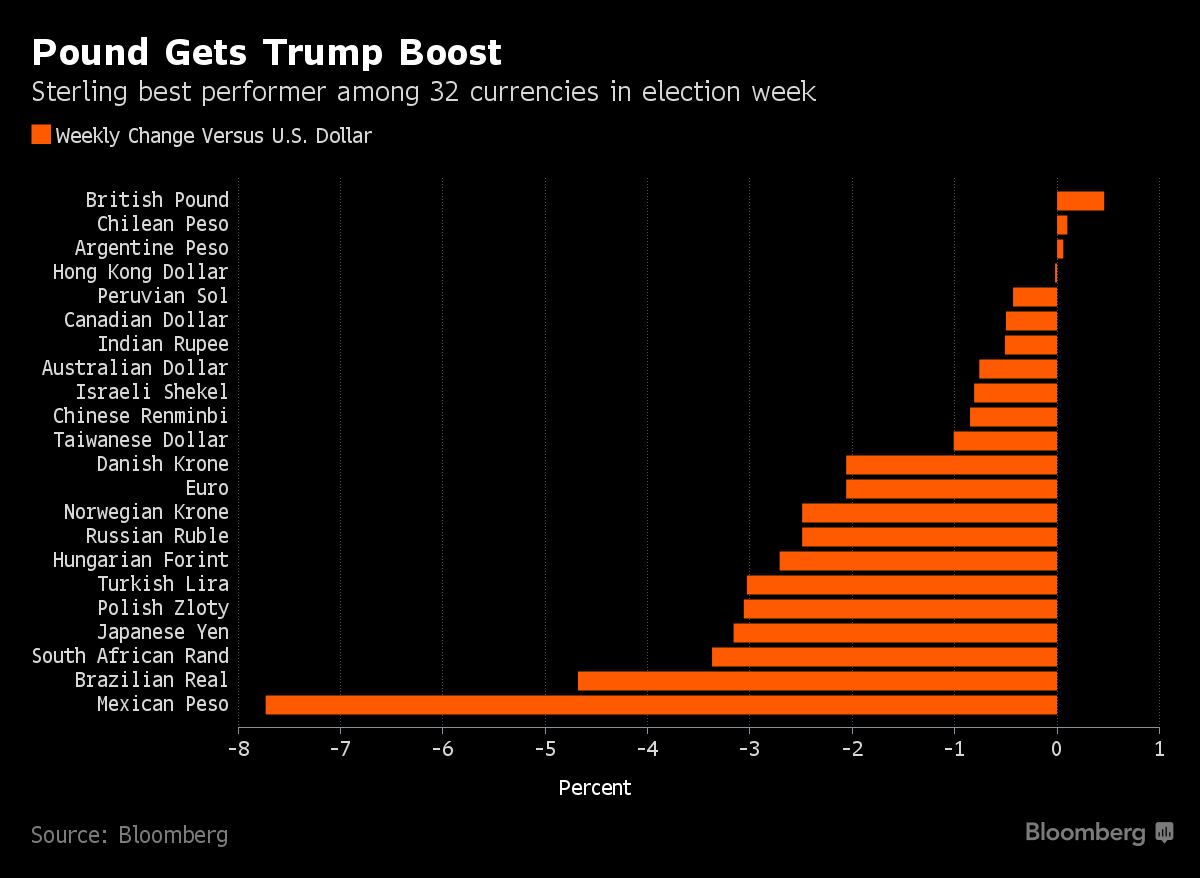 Британская валюта устремилась к лучшей неделе против евро с июля 2015 года, так как инвесторы пытались оценить, как именно усиление популизма может повлиять на евро, учитывая, что несколько стран в регионе будут голосовать в ближайшие месяцы, и как торговые потоки могут изменить направление, в случае если Трамп продолжит придерживаться протекционистской политики.