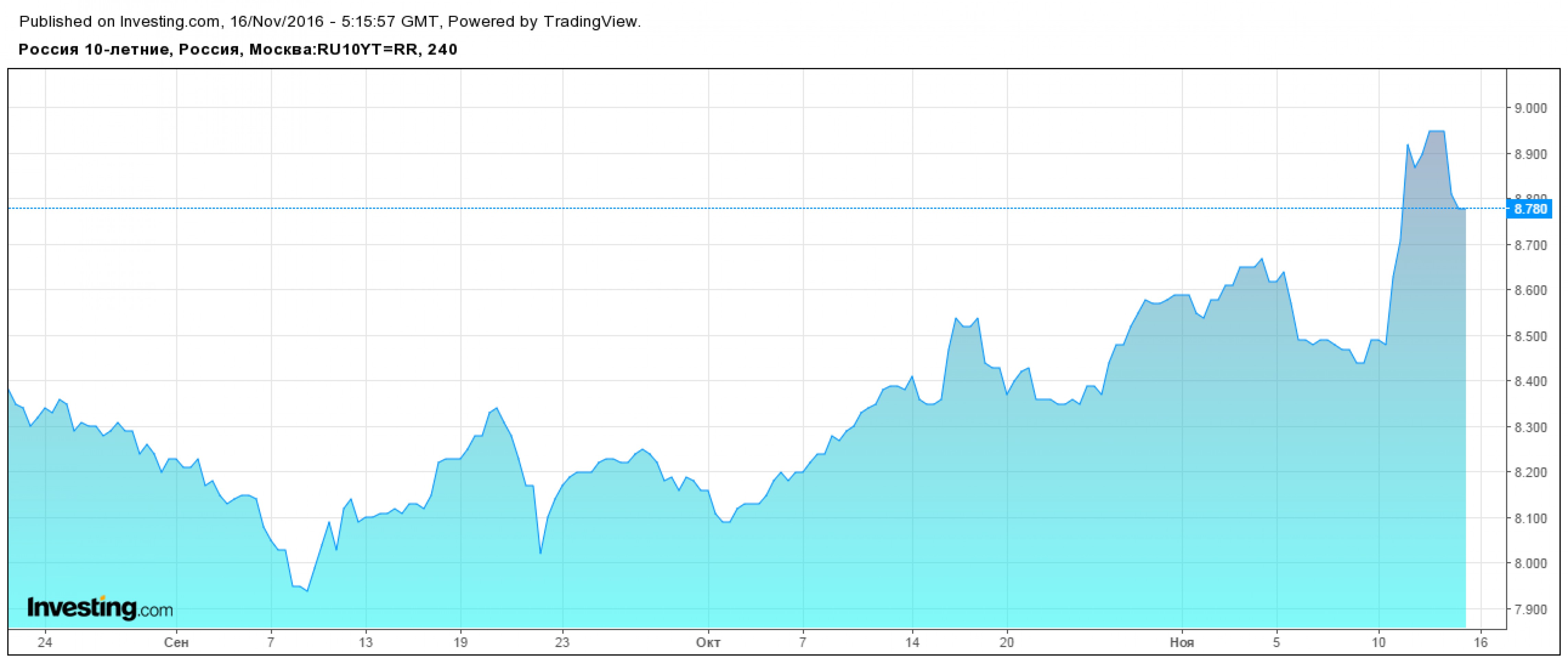 На этом фоне мы увидели покупки в российских бумагах. Доходности десятилетних ОФЗ опустились до 8,78%, хотя еще на днях они вплотную подбирались к отметке 9%.