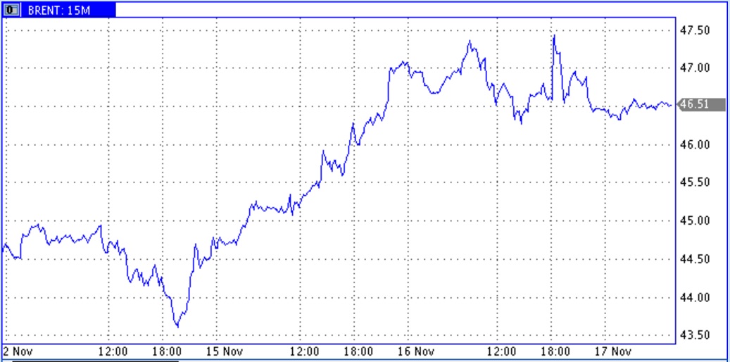 Цены нефти и нефтепродуктов за прошедшие сутки немного снизились, частично скорректировав подскок предыдущего дня. Снижение происходило на фоне обсуждений сообщения геологической службы США об открытии крупнейшего нефтегазового месторождения страны на западе штата Техас. По ее оценке, запасы составляют 20 миллиардов баррелей нефти и 453 миллиарда кубометров природного газа. Такой месторождение может хорошо дополнить месторождение Permian, но для более подробного прояснения ситуации еще потребуется время. Конкурирующей для динамики цен идеей является активизирующаяся подготовка для намеченной на 30 ноября встречи ОПЕК. Теперь будет уплотняться поток сообщений из разных стран об их готовности заморозить добычу. Как лебедь, рак и щука, разные обстоятельства толкают цены нефти в свою сторону. Но в итоге цены вот уже второй день совершают лишь колебательные движения вблизи 46,5 долларов за баррель.