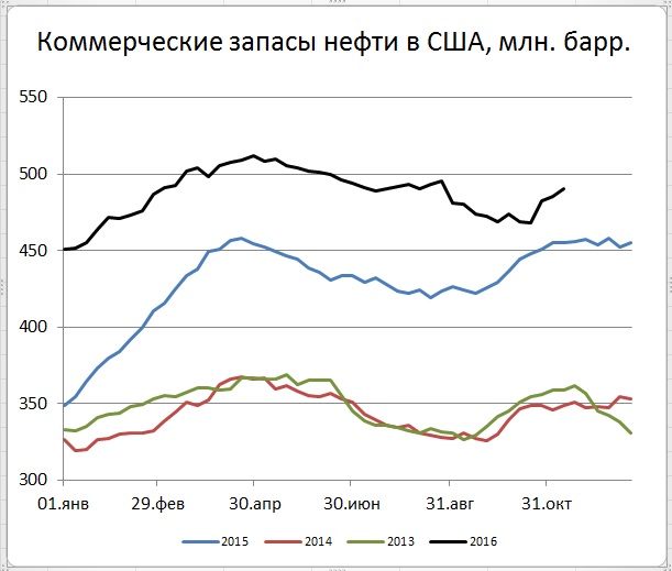 Важным текущим событием ушедшего дня стали недельные дынные Минэнерго США по запасам и добыче нефти. За неделю, закончившуюся 11 ноября 2016 года, коммерческие запасы нефти в США выросли на 5,274 млн. баррелей (до 490,284 c 485,01 млн. баррелей неделей ранее). Запасы моторного топлива на этот раз за неделю подросли на 0,7 млн. баррелей (до 221,7 с 221,0 млн. баррелей неделей ранее). Нетто импорт нефти и нефтепродуктов за неделю вырос на 1,326 mb/d (до 5,668 с 4,342 mb/d в предыдущую неделю). Импорт нефти за неделю подрос на 0,91 mb/d. Суммарные запасы нефти и нефтепродуктов за неделю выросли на 7,1 млн. баррелей (до 2035,9 с 2028,9 млн. бар. неделей ранее – вновь посылают улыбку чудеса округления). По суммарным запасам вернулись на уровни двухнедельной давности.