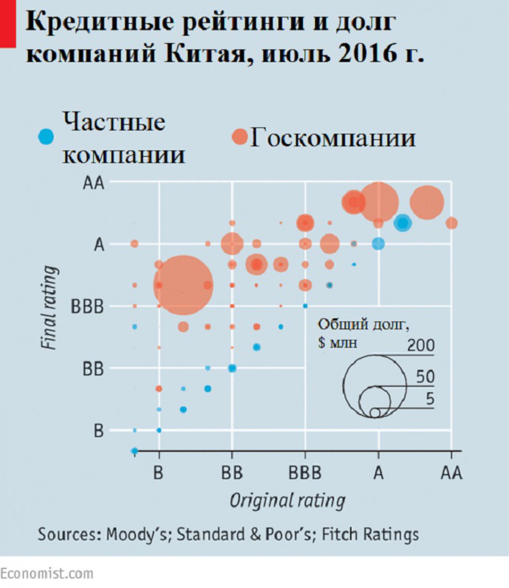 Представленный график иллюстрирует размер получаемой госпредприятиями выгоды. Горизонтальная ось показывает их первоначальный рейтинг (базирующийся на среднем показателе Fitch, Moody’s и S&P - трех крупнейших рейтинговых агентств). Вертикальная ось демонстрирует их окончательный рейтинг, после того как в сумму включена потенциальная государственная поддержка. Размер пузыря указывает на объем долговых обязательств.