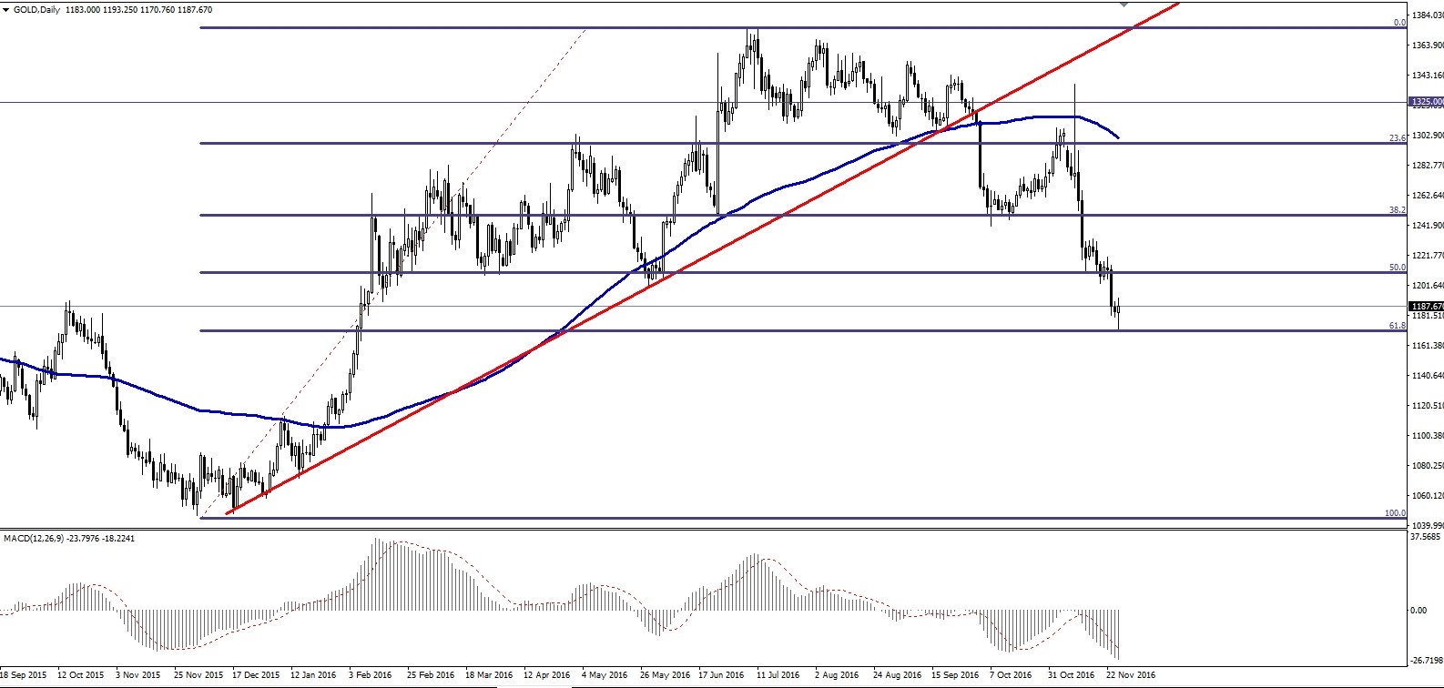 Но если вы склонны к контртрендовым позициям или не считаете, что тренд развернулся, то текущие уровни выглядят достаточно интересными для длинных позиций. Золото сделало ровно 61.8%-ую коррекцию от своего максимума. Это уже третья попытка задержаться у уровней Фибоначчи. Сначала цены откорректировались на 38.2%, далее задержались, но недолго на половине пути (50% коррекции), и вот третья попытка сделать передышку. Если это разворот тренда, ты мы не долго задержимся выше 1180-1187. Но до 14 декабря, вероятно рынок сделает паузу, и небольшой отскок, даст возможность взять немного прибыли.