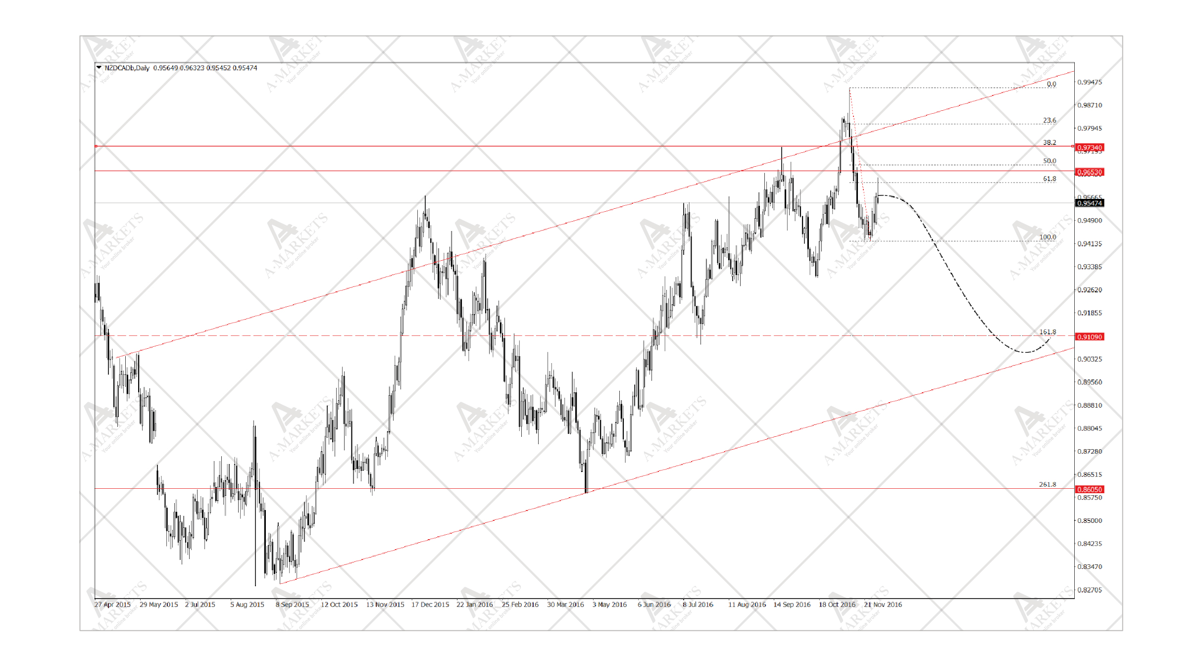 Мы открываем шорт по NZDCAD на уровне 0.96, take profit на 0.912, stop loss на 0.974.