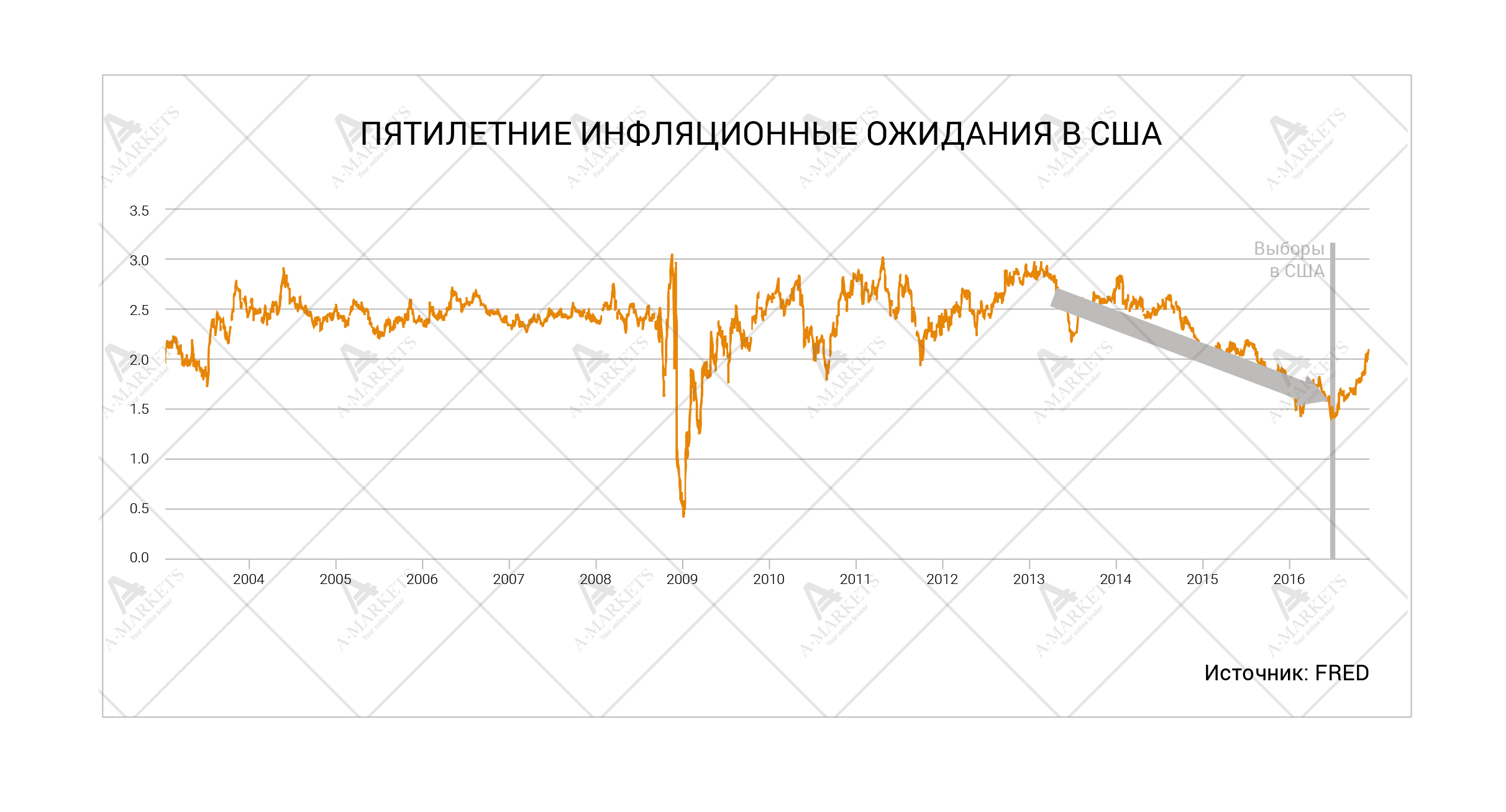 Они вернулись к средним историческим уровням, и это важнейший итог победы Трампа еще до его вступления в должность. Буквально месяц назад казалось, что невозможно придумать чего-то, способного подхлестнуть инфляционные ожидания. Даже в арсенале монетарной политики сложно было изыскать дополнительные инструменты, которые могли бы принципиально изменить ситуацию. Даже программе количественно смягчения ФРС это не удалось. В отсутствие некого потрясения, вполне мог материализоваться риск возникновения дефляционных сил. Но потрясение случилось, и зовут его Дональд Трамп. Факт избрания его следующим президентом США застал рынки врасплох, а это необходимое условие для разворота настроений.