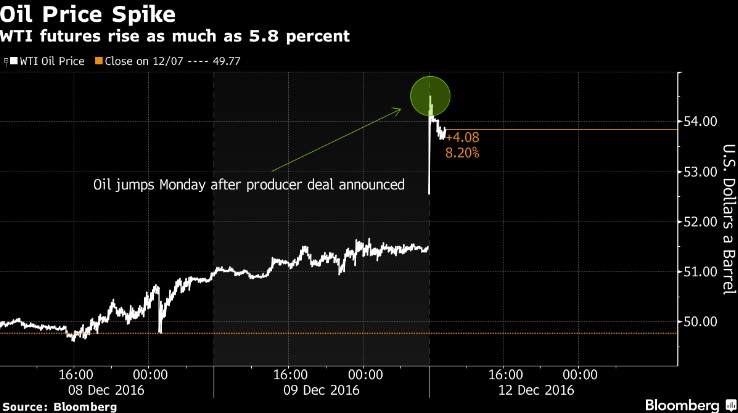 Фьючерсы выросли почти на 5.8% в Нью-Йорке и на 6.6% в Лондоне. Министр энергетики Саудовской Аравии Халид Аль-Фалих заявил в субботу о том, что крупнейший экспортер нефти “существенно сократит” объем добычи ниже целевого порога, одобренного в прошлом месяце с членами ОПЕК. Комментарии Аль-Фалиха последовали за сделкой с не входящими в ОПЕК странами, включая Мексику, чтобы объединить силы с группой в сокращении добычи на 558k баррелей в сутки в следующем году, что станет первой сделкой между конкурентами за последние 15 лет.