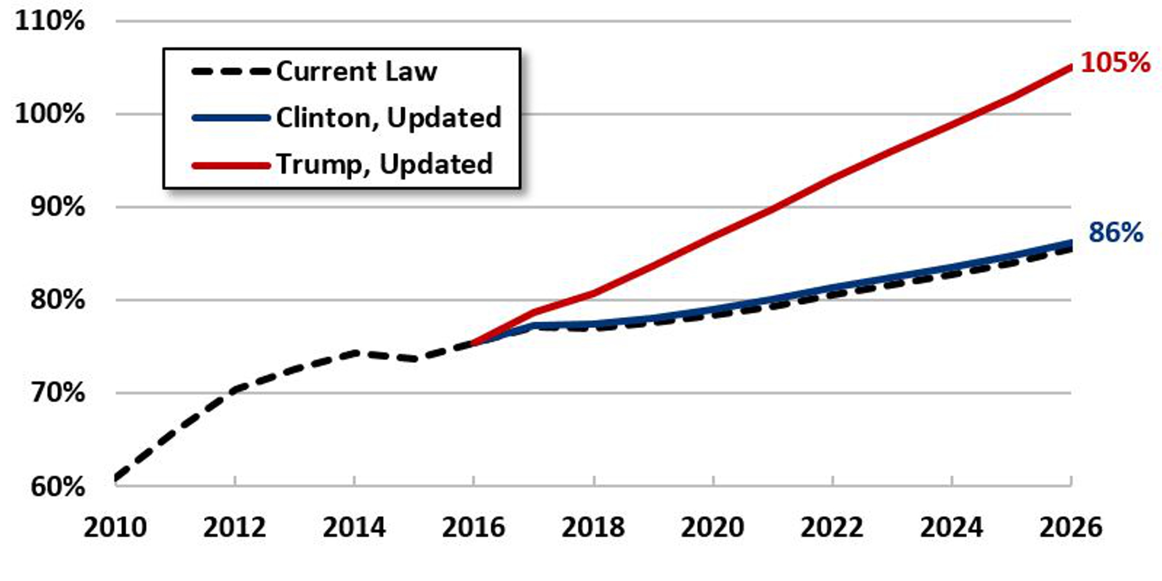Между тем, реформы Трампа могут привести к увеличению государственного долга на $5 трлн. Если сравнить план бюджета, предлагаемого Трампом и принятый план бюджета палаты представителей США, обнаруживается дыра в $12 трлн в случае реализации плана Трампа "Сделать Америку снова великой", который должен быть реализован в ближайшие 10 лет.
