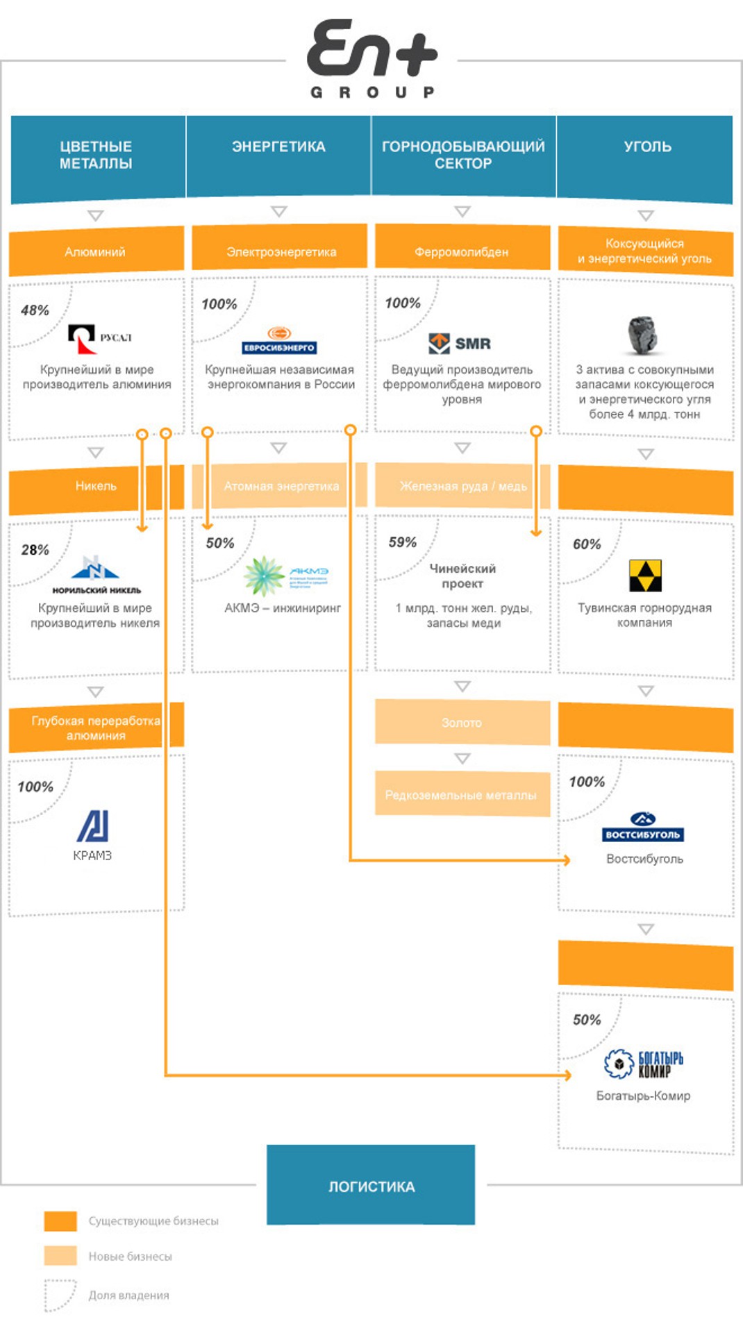 En+ Group владеет рядом крупных активов в сфере энергетики, цветной металлургии и горнорудной промышленности, а также логистики. Наиболее крупными активами En+ Group являются 48%-я доля в компании UC Rusal, а также доля в энергетической компании "Евросибэнерго".