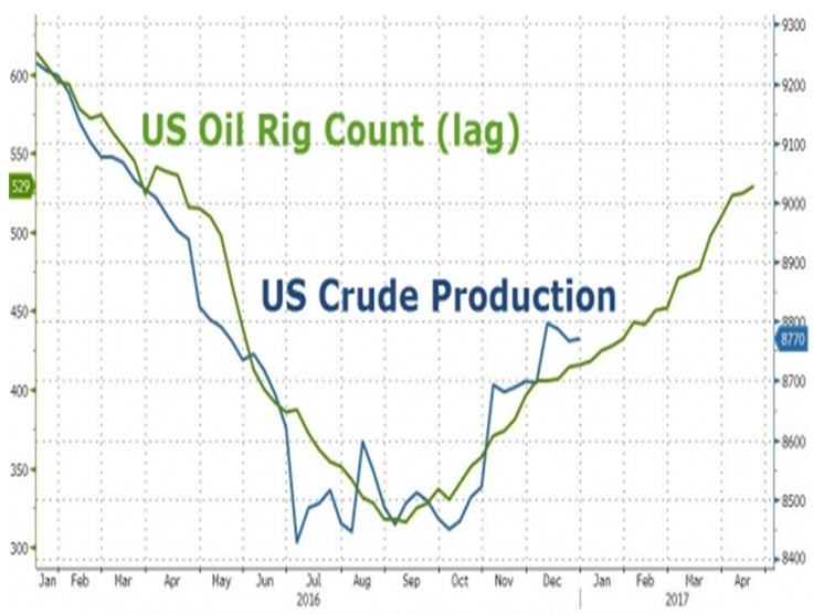 После значительного роста числа активных буровых теперь очередь за добычей. Помним, что динамика добычи отстает по фазе от динамики буровых и интенсивное снижение добычи нефти в США началось лишь через полгода после начала провала числа буровых. Наблюдающееся сейчас подрастание добычи тоже оказывается на несколько месяцев смещенным относительно минимума числа активных буровых, и, с большой вероятностью, будет иметь продолжение. Особенно если число активных буровых продолжит свой рост в условиях уже довольно высоких цен нефти.