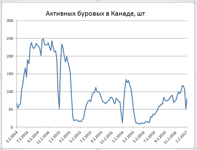 Мы уже много раз обращали внимание на сильную сезонность работ в Канаде. Особенно выразительным бывает провал буровых работ перед новым годом. В этом году тоже произошло сильное (более чем двукратное) снижение числа работающих буровых. Но это снижение оказалось меньше, чем бывало в прошлые годы. (Так, например провал конца 2015 года опустил их число почти до нуля). Кроме того, на текущей неделе произошло возвратное резкое восстановление числа активных буровых.