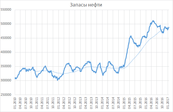 Запасы сырой нефти в США потихоньку растут третью неделю подряд. И причина тут вовсе не в низком потреблении. Как раз наоборот, сильный потребительский спрос и холода в США должны отрицательно сказываться на запасах. Тем не менее, за три недели они выросли на 9.3 млн. баррелей и уже поднялись к уровням середины ноября. Примерно в эти же дни годом ранее на рынках разговоры были только о том, как много нефти в хранилищах США. Сейчас их на 5.3% больше, чем ровно год назад. Кроме того, нам известно, что несмотря на ограничения добычи, в ОПЕК сейчас добывают больше нефти, чем ровно год назад, и в России тоже. В США добыча растёт, уже достигая 8.96 млн. барр/день. Хотя это ниже уровня 9.2 млн. ровно год назад, это выше летних уровней около 8.5 млн.