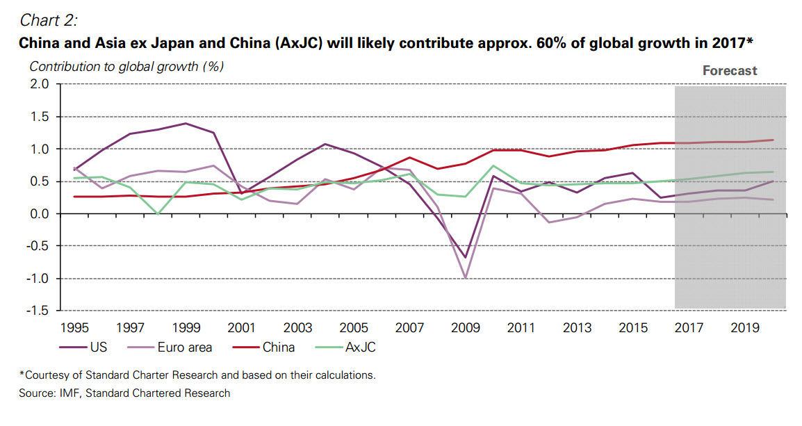Азиатские рынки успешно восстановились после кризиса, и эксперты предполагают, что в 2017 году около 60% мирового роста ВВП будет формироваться в Азии, в отличие от Европы, где рост будет слабым (рис.1). В свою очередь покупательная способность населения в Азии тесно связана со спросом на золото. Потребление золота в Азии в последние десятилетия выросло с 25% от мирового спроса в 1990 г. до 50% в 2016 г.