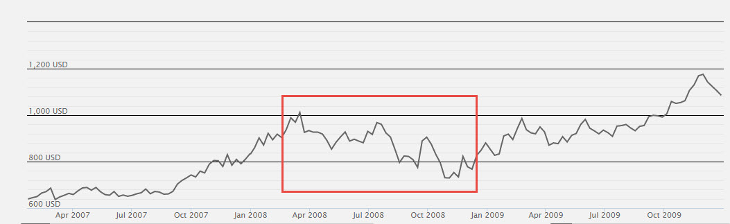 Рис.2: Падение цены золота на фоне кризисных явлений в экономике.