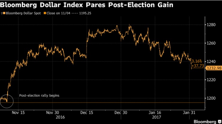 Снижение доллара началось ранее в течение дня после того, как советник президента Питер Наварро заявил о том, что евро “сильно недооценен”. Эти комментарии последовали после указа Трампа в отношении иммиграции и стены на границе с Мексикой, подчеркивая деловую неопределенность США, тогда как бизнес все больше думает, что ралли на победе Трампа может выдохнуться.