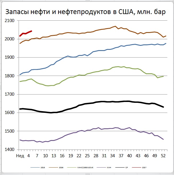 Запасы моторного топлива за неделю выросли на 3,9 mb. А суммарные запасы нефти и нефтепродуктов – выросли на 5,3 млн. баррелей (до 2042,5 с 2037,3 mb). Как видим, рост суммарной позиции оказался не очень большим за счет ускоренного расхода в зимнее время пропан-пропиленовых фракций. Но все же суммарные запасы пока держатся систематически выше уровней прошедшего года. Стратегические запасы, распродажи которых теперь будут ожидать еженедельно, пока не шелохнулись, оставшись на отметке 695,1 млн. баррелей. Суммарный импорт нефти и нефтепродуктов за неделю подрос на 0,263 mb/d (до 5,013 с 4,75 mb/d неделей ранее).