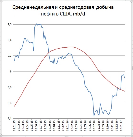 Согласно оценкам EIA среднедневные объемы добычи за неделю, закончившуюся 27 января, снизились на 46 тыс. баррелей в сутки (до 8,915 с 8,961 mb/d неделей ранее). Страшно предположить: неужели команда Трампа тайно присоединились к соглашению стран ОПЕК+?.. От минимальных отметок добыча на текущий момент теперь выше на 487 тыс. баррелей. От максимумов лета 2015 года урони добычи теперь отделяет 695 tb/d (7,2%).