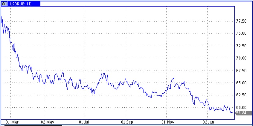 Укреплению рубля способствуют активно всплывающие по разным поводам надежды на ослабление режима санкций. Контакты с новой администрацией США, а также известия о частичном снятии санкций с ФСБ. Здесь по-прежнему ситуация остается очень динамичной и достигнутые уровни по рублю все более привлекают потенциальных покупателей валюты.