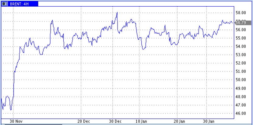 Сильные факторы воздействия на цены с противоположных направлений пока в значительной мере уравновешивают друг друга (так сокращение добычи со стороны ОПЕК в известной мере компенсируется ростом добычи в США), а цены нефти продолжают колебания в диапазоне 54-57 долларов за баррель (по нефти марки Brent).