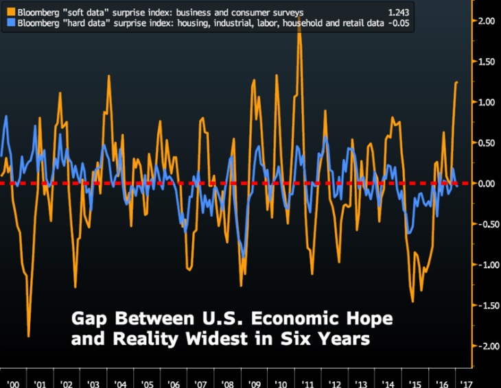 Предпочтения акциям против облигаций после выборов почти полностью развернулись, тогда как четырехнедельный тренд притока средств в фонды облигаций США превышает максимум за 6 месяцев. Послевыборная сверхдоходность корзины акций прекратилась; сейчас этот тренд вытягивает обратно рост S&P 500 за период после выборов. Доходность казначейских облигаций, защищённых от инфляции, подскочила почти на 60 базисных пунктов в течение 5 недель следом за 8 ноября, однако с тех пор скорретировала почти половину этой динамики. “Как бы иронично это не звучало, но риском для рынков может быть сила недавних макроэкономических данных, которая могла бы толкнуть их к закладыванию устойчивого улучшения роста ВВП. Результатом явится все большая уверенность рынков в том, что политика Трампа скорее толкнет вверх инфляцию, нежели поддержит рост в краткосрочной перспективе”.