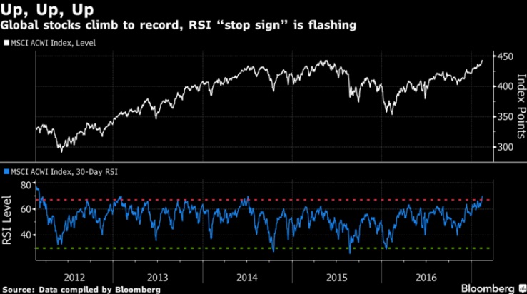 Акции по всему миру подскочили в стоимости более чем до $70 трлн. в рамках ралли после избрания президента Трампа, что вызвало оптимизм в отношении усиления экономического роста в США. Технический индикатор показал, что широкий индекс силы глобальных акций MSCI может быть перекупленным, тогда как индекс волатильности S&P 500 вырос максимально с января в среду.