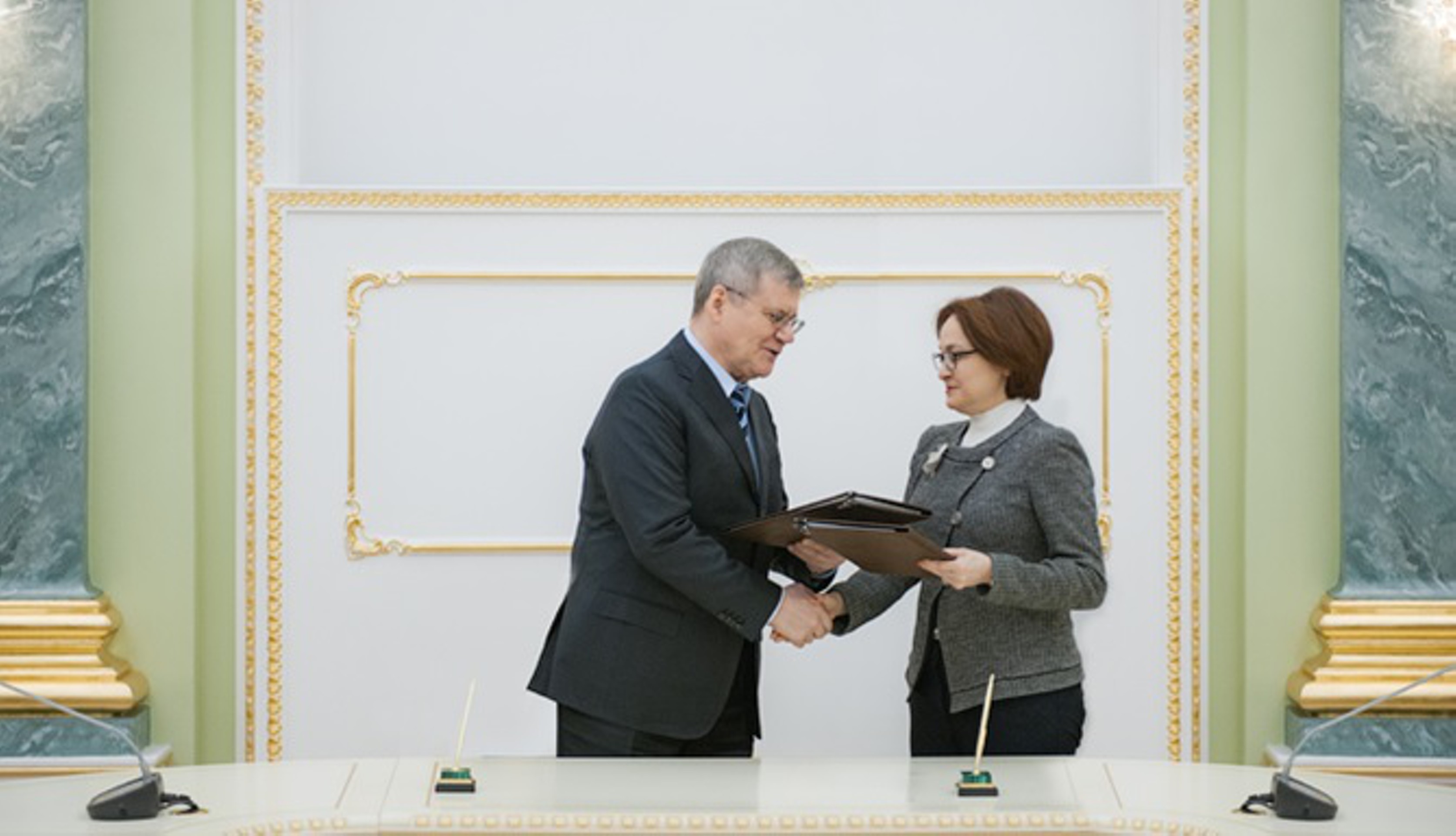 Генеральный прокурор Российской Федерации Юрий Чайка и председатель Центрального банка Российской Федерации Эльвира Набиуллина подписали Соглашение о взаимодействии Генеральной прокуратуры РФ и Центрального банка РФ.
