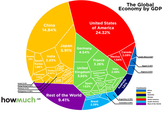 На графике HowMuch.net показано, что на экономику США приходится около четверти глобальной экономики, и примерно на 10% выше китайских 14.84%. Если посмотреть с другой стороны, то экономика США эквивалента в сумме ВВП восьми следующих крупнейших стран после Китая: Японии, Германии, Британии, Франции, Индии, Италии, Бразилии и Канады.