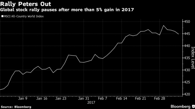 Беспокойство может усиливаться следом за наиболее крупным ралли в истории, которое привело стоимость глобальных акций к $71 трлн. на фоне оптимизма, что политика Трампа может стимулировать рост за счет крупных проектов и снижения налогов. Это толкнуло оценки индекса MSCI All Country в сторону максимумов с 2015 года. Индекс MSCI Азиатско-Тихоокеанского региона снизился менее чем на 0.1% по состоянию 14:52 в Токио, и почти 600 акций падали против 350, которые росли. Японский Topix снизился на 0.4%, снижаясь третий раз за последние 4 дня. Индекс Stoxx Europe 600 снизился на 0.3% во вторник после снижения на 0.5% в понедельник. Иена выросла на 0.2% до 113.75 за доллар. Австралийский доллар вырос на 0.1%, киви добавил 0.2%.