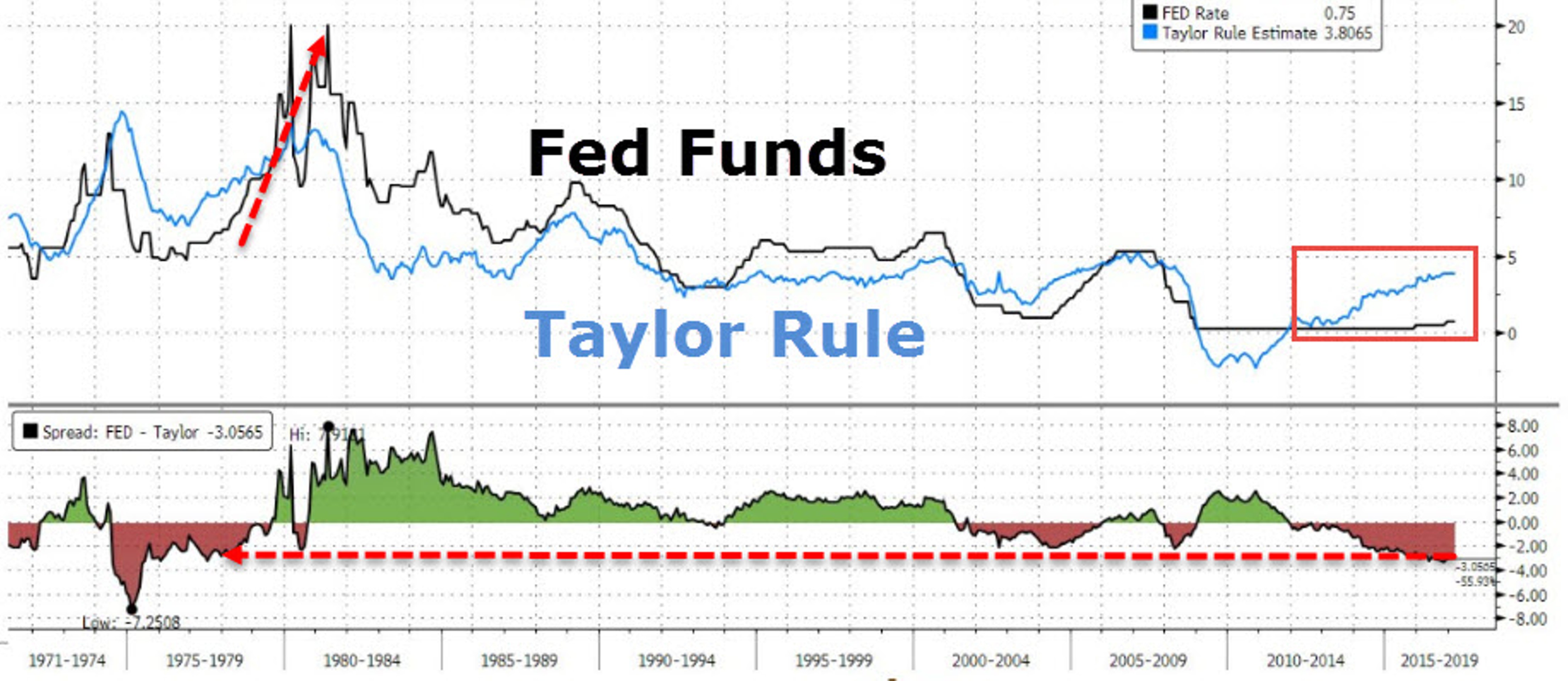 Сейчас правило Тейлора предполагает ставку на уровне чуть выше 3,8%, тогда как в реальности ФРС удерживает ее на уровне 0,5-0,75%. Разница уже превышает 300 базисных пунктов, и это максимальный уровень с 1977 г.