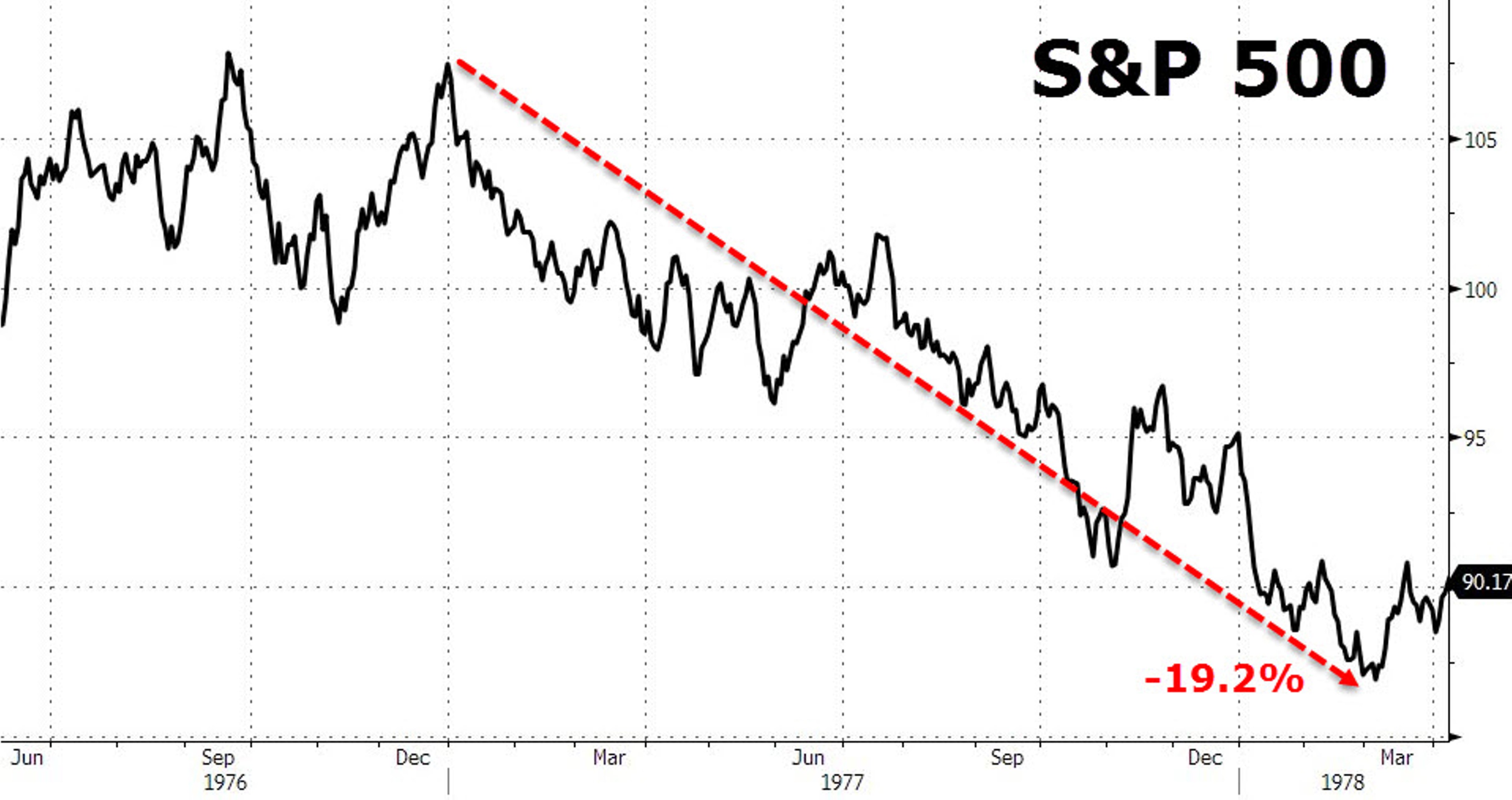 Кстати, рынок в 1977 г. упал почти на 20%, поскольку ФРС внезапно осознала реальность и поспешила ее "догнать". Примерно это мы наблюдаем сейчас, и есть достаточно большая вероятность, что падение повторится.