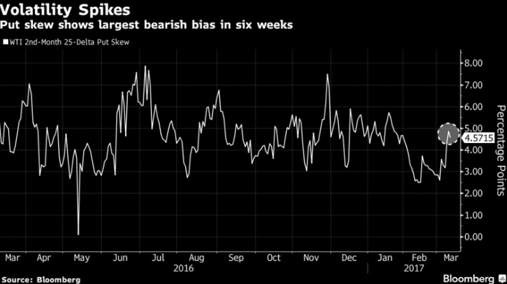 Обвал нефти вернул на рынки волнение. Фьючерсы упали до минимума с момента достижения ОПЕК сделки в ноябре, торговля опционами выросла и сигнализировала о самом большом за последнее время уклоне в сторону снижения цен за 6 недель. Это огромная разница с прошлым месяцем, когда WTI торговалась в наиболее узком диапазоне с 2003 года.