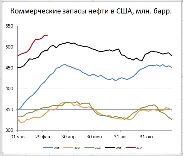 Во-вторых, EIA опубликовало недельные данные по запасам и добыче нефти. За неделю, закончившуюся 10 марта 2017 года, коммерческие запасы нефти в США снизились на 0,237 до 528,156 mb. Интрига была в ожиданиях снижения запасов была в том, что это первое снижение с конца прошлого года. Но снижение было совсем небольшим и уже было предварено выходившими накануне данными от API. Напомним, что по вышедшим ранее данным API запасы сырой нефти: -0,531 mb; запасы в Кушинге: +2.06 mb; запасы бензина: -3.88 mb и запасы дистиллятов: -4.07 mb. Стоит отдельно отметить, что запасы Кушинга, являющиеся обеспечением для торговли на NYMEX, по данным EIA на этот раз возросли на 2,1 млн баррелей до 66,5 млн баррелей.
