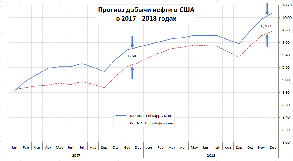 При этом, как это часто бывает - слухи оказались несколько преувеличенными. Действительно, Агентство Энергетической Информации США в марте, по сравнению с февралем существенно повысило прогноз по добыче нефти в США. Теперь, в декабре 2017 года прогнозируется добыча нефти на уровне9.53 млн. баррелей в сутки, а не 9.28 млн. баррелей, как это планировалось в еще месяц назад (рис.1).
