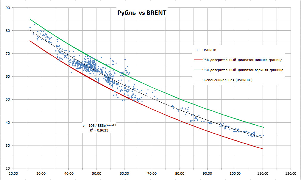 рис.1: Экспоненциальная регрессия курса рубля и сорта нефти Brent.