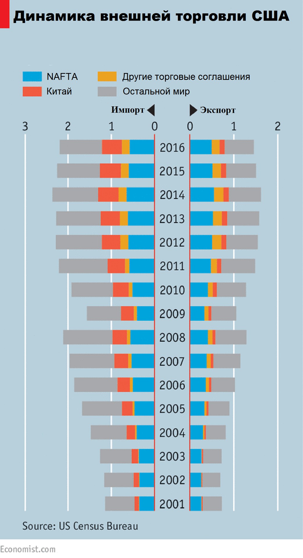 Наибольший дефицит в торговле у США в 2016 г. зафиксирован с Китаем ($347 млрд), второе место занимает Япония ($69 млрд), третье – Германия ($65 млрд). C Мексикой торговый дефицит составил $63 млрд.