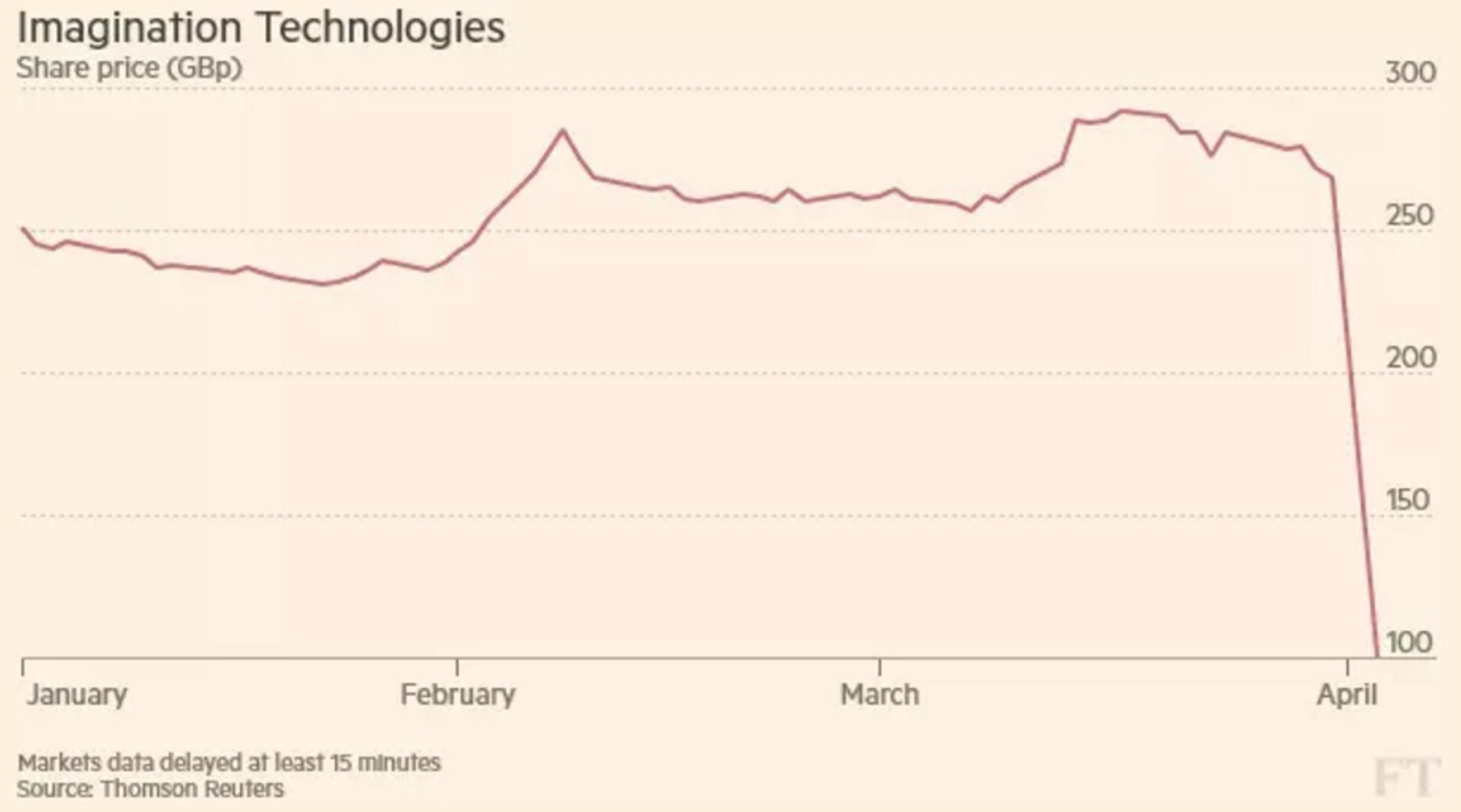 Акции компании Imagination Tech упали на 69% в понедельник, после того как ее крупнейший клиент - Apple - заявил, что в течение двух лет прекратит использовать графические технологии британской фирмы при производстве iPhone и других продуктов.