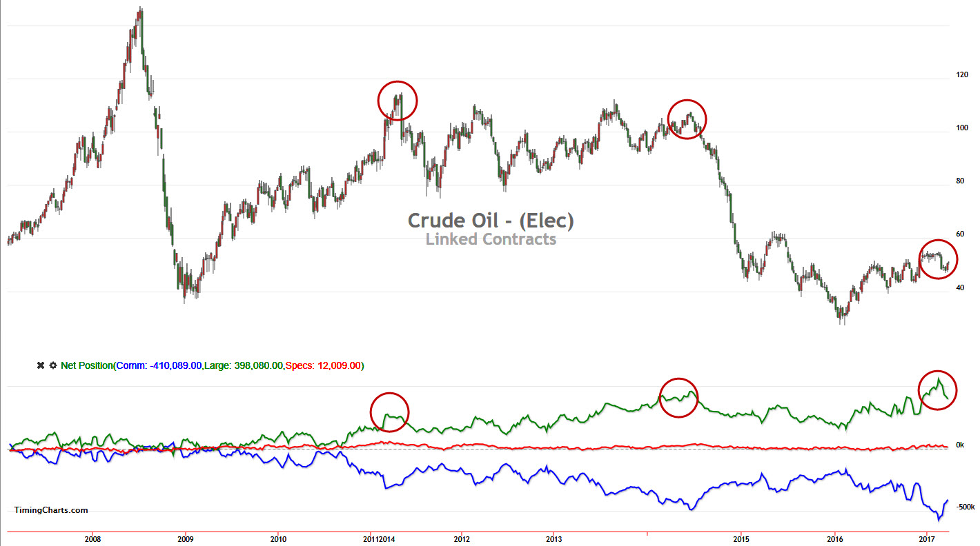 Интересно, что крупные спекулянты традиционно покупают нефть, а хеджеры наоборот традиционно её продают, так, что именно спекулянтам Россия обязана своим текущим благосостоянием, но не об этом сейчас речь. Характерно, что когда позиции спекулянтов достигают некоторых экстремальных значений, тренд разворачивается. Некоторые моменты, когда цены на нефть разворачивались при достижении максимума длинных позиций спекулянтов, отмечены на графике (рис.1).