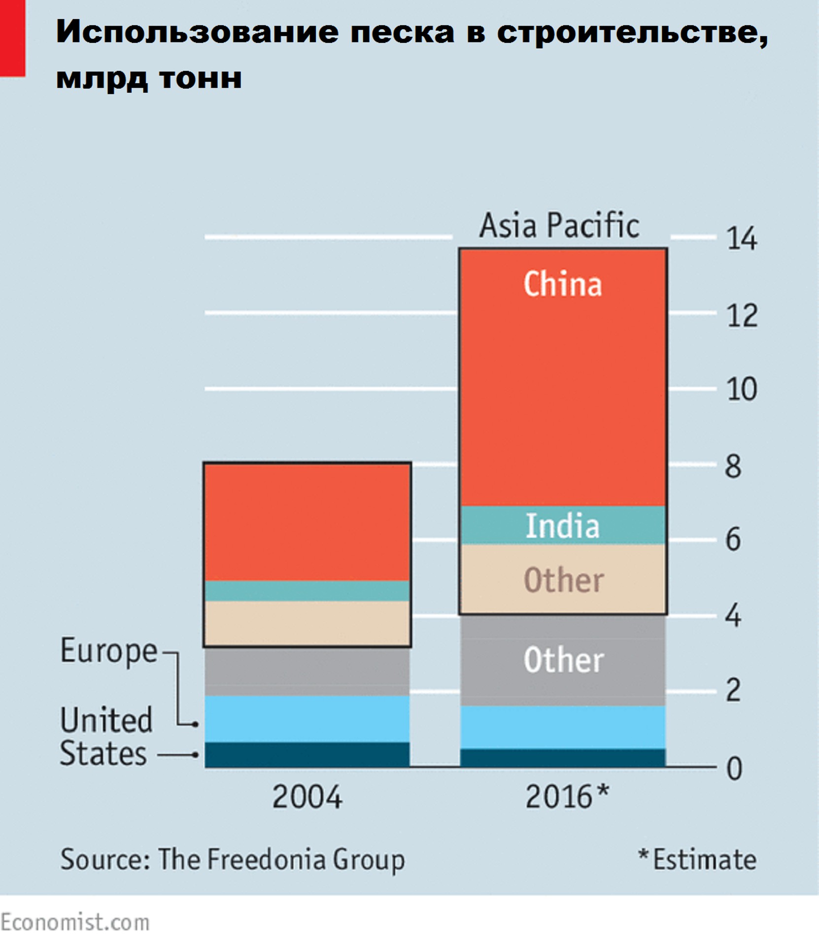 Согласно данным исследовательской фирмы Freedonia Group в прошлом году в мире было добыто 13,7 млрд тонн песка, 70% которого было использовано в Азии. Половина этого объема перерабатывается в Китае, где, по оценке правительства, с 2011 по 2015 гг. было построено 32,3 млн домов и 4,5 млн км автомобильных дорог.