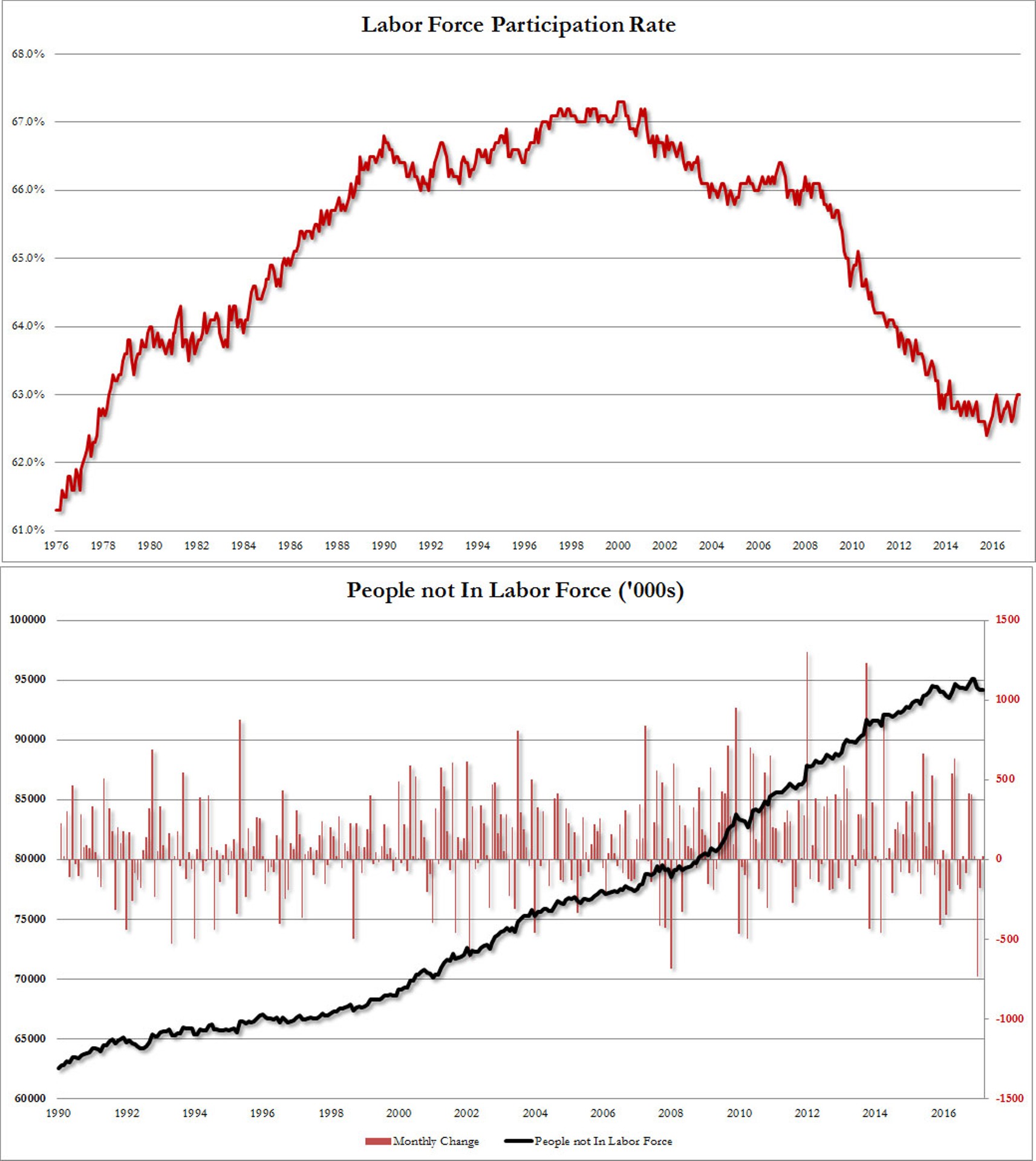 При этом уровень безработицы снизился с 4,7% до 4,5%, но этот фокус уже не работает: все прекрасно понимают, что снижение безработицы происходит из-за изменений числа людей, участвующих в рабочей силе. В марте показатель составил 94,213 млн человек.