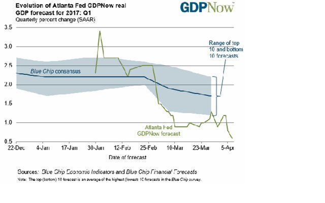 Ну и еще одним подтверждением того, что Обама оставил Трампу в наследство экономику в далеко не лучшем виде, является прогноз от ФРБ Атланты. Модель прогнозирования GDP Online указывает на рост ВВП в I квартале всего на 0,6%.