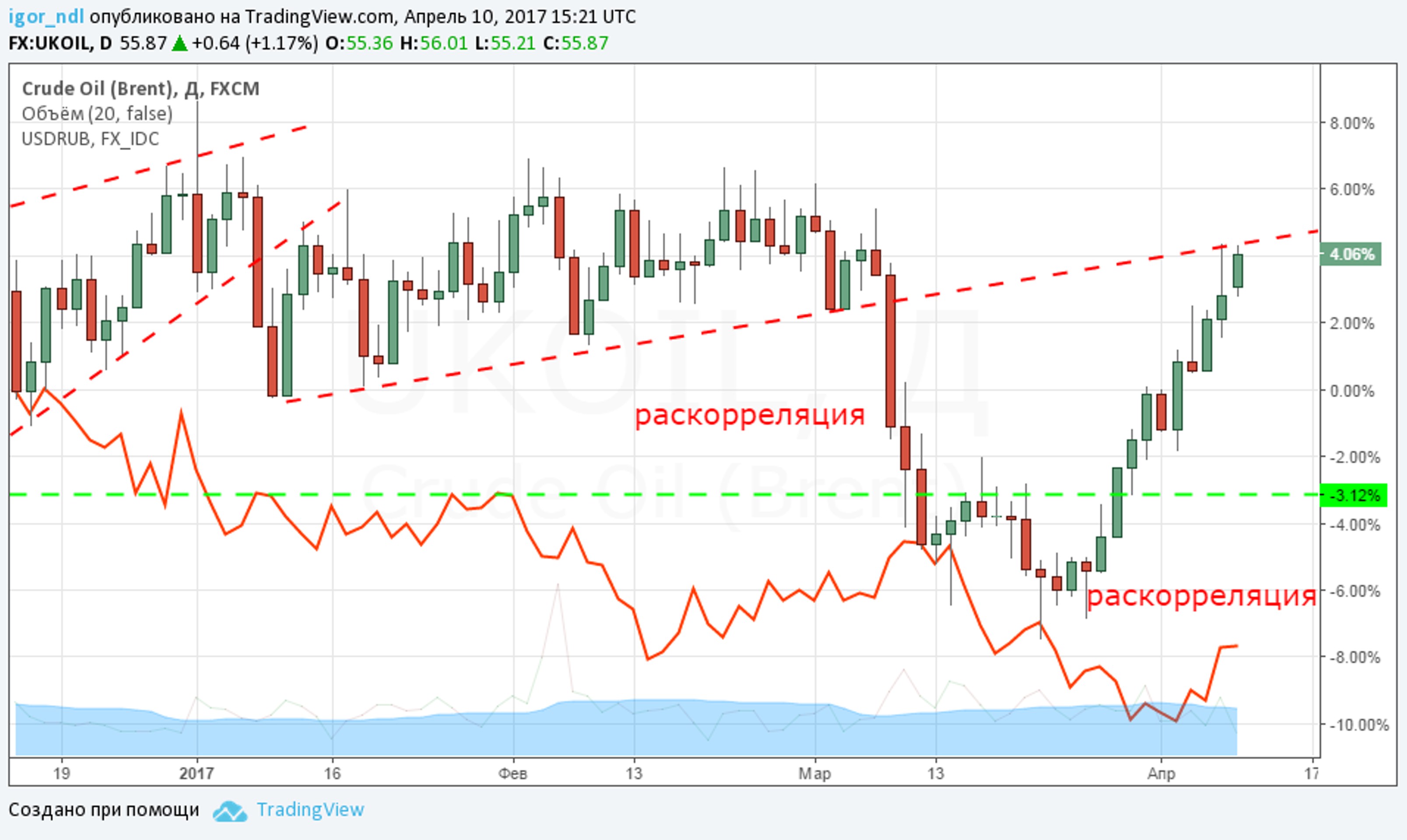 Проще говоря, когда в середине марта нефть дешевела, рубль стоял или укреплялся, сейчас обратная ситуация, нефть дорожает, а рубль немного дешевеет. Вот и все.