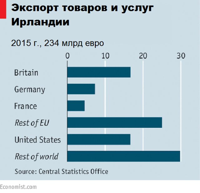 Не следует также забывать, что ирландские экспортеры в Европу используют Великобританию в качестве сухопутного коридора, так как транспортировка грузов морем намного проблематичнее, чем на грузовиках. Четверть ирландского импорта поступает из Великобритании, отчасти из-за того, что крупные британские сети имеют супермаркеты в Ирландии.