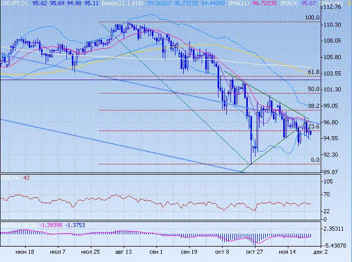 Пара удерживается под 95,60, торговля велась в узком диапазоне. Сильное сопротивление доллару также оказывают отметки в районе 96,80. Поддержки расположены в районе 94,00 и далее более сильные на 93,20.