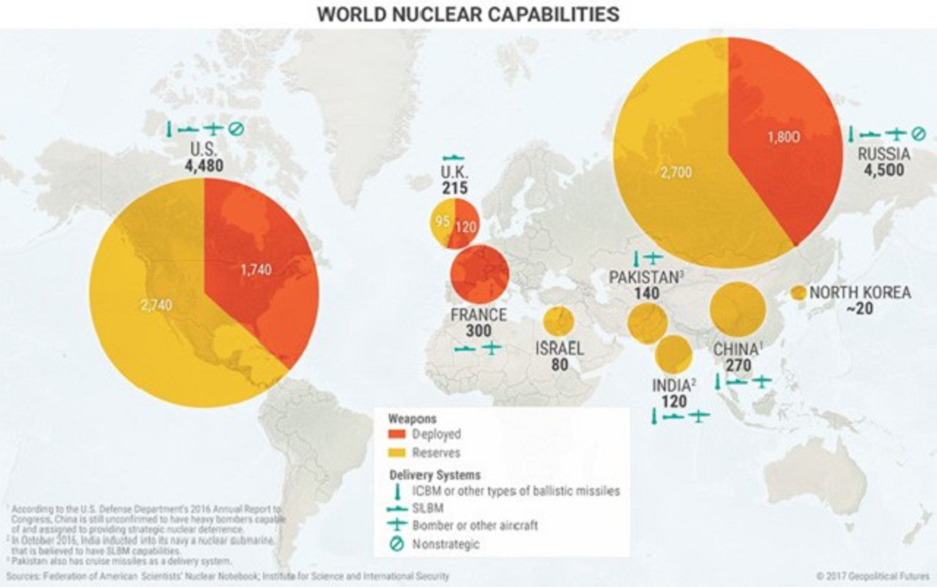 На этой карте выделены три аспекта мирового ядерного арсенала.
