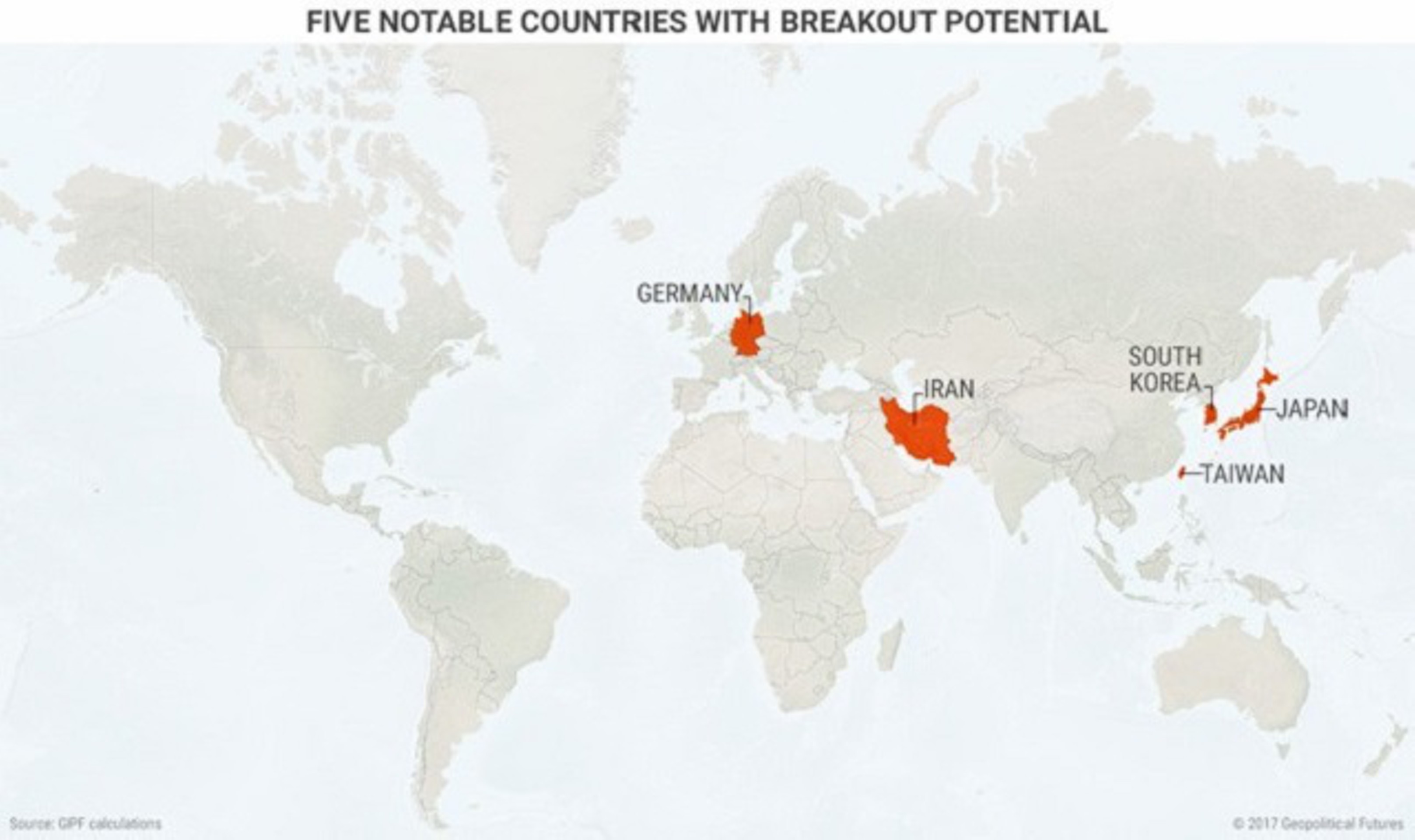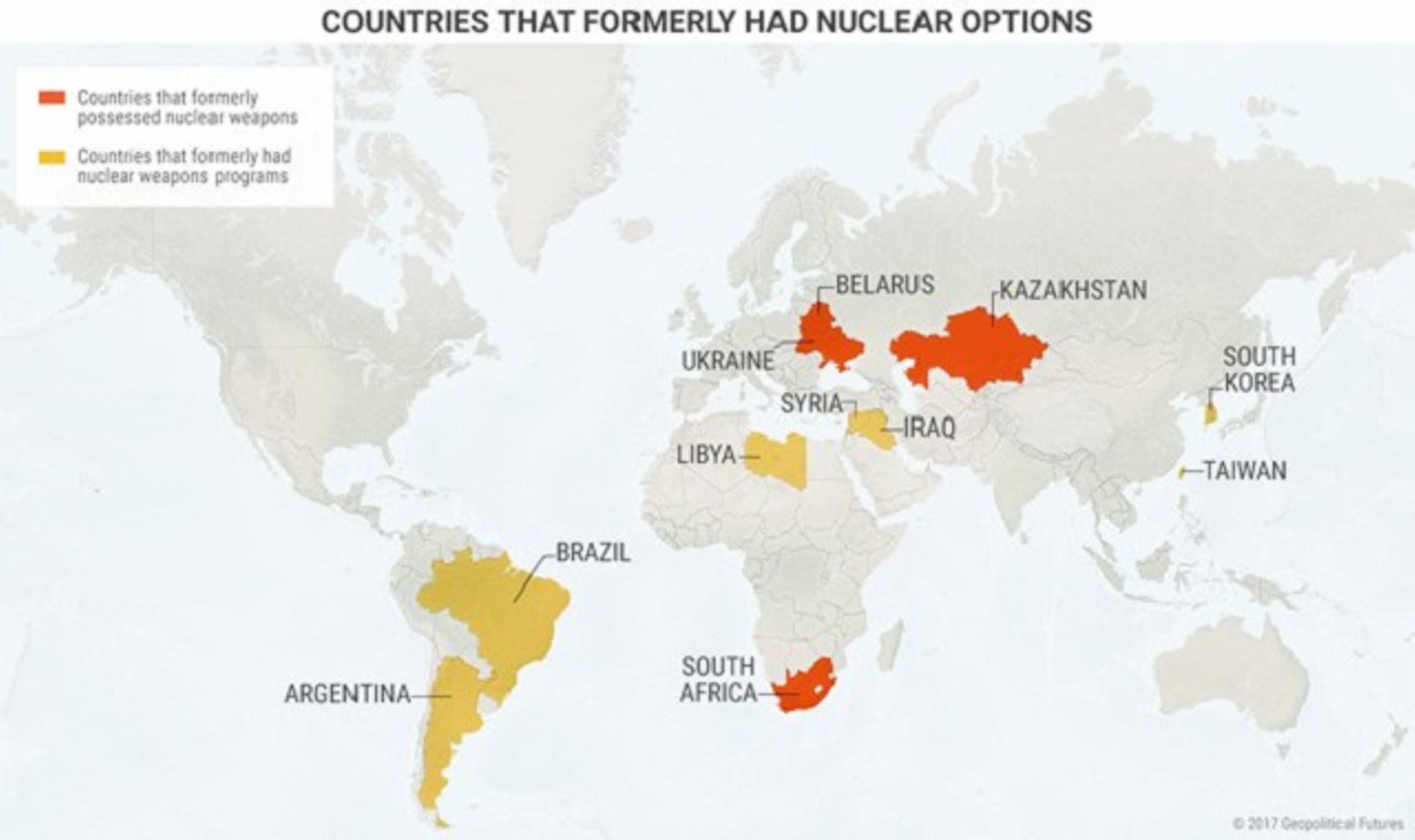 Для того чтобы создать ядерное оружие, страна должна иметь необходимые технические знания и возможности, хорошо развитый промышленный сектор, технологические и экономические ресурсы. Из 31 страны, которая этим обладает, выделяют пять наиболее важных стран, для которых приобретение ядерного оружия коренным образом повлияет на отношения с обоими своими соседями по региону и мировыми силами.