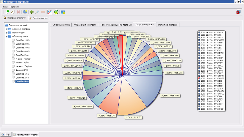 На круговой диаграмме изображено распределение денежных средств между рабочими инструментами. Как можно увидеть, чуть большую долю занимают акции AAPL (Apple) и GS (Goldman Sachs). Именно по этим двум инструментам отмечена более устойчивая работа большинства алгоритмов, как трендового принципа, так и контртрендового.